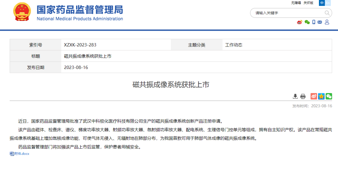 2023年8月16日,源于中國科學(xué)院精密測量科學(xué)與技術(shù)創(chuàng)新研究院(以下簡稱精密測量院)超靈敏磁共振團(tuán)隊(duì)原創(chuàng)技術(shù),由武漢中科極化醫(yī)療科技有限公司(以下簡稱中科極化)孵化,具有完全自主知識(shí)產(chǎn)權(quán)的創(chuàng)新醫(yī)療器械“肺部氣體多核磁共振成像系統(tǒng)”在歷經(jīng)樣機(jī)研制、器械檢測、臨床試驗(yàn)、注冊(cè)申報(bào)等多項(xiàng)環(huán)節(jié)后,終于取得重大突破,正式獲批國家藥監(jiān)局三類醫(yī)療器械注冊(cè)證。 這是當(dāng)前全球首臺(tái)獲批的可用于肺部氣體成像的臨床多核磁共振成像系統(tǒng),解決了臨床無創(chuàng)無輻射精準(zhǔn)檢測肺部疾病的科學(xué)難題。